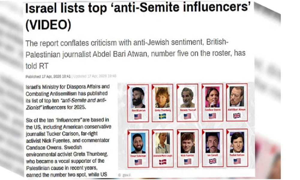 ইসরায়েলের প্রবাসী এবং ইহুদিবিদ্বেষ দমনবিষয়ক মন্ত্রণালয় ২০২৫ সালের বিশ্বের শীর্ষ ১০ জন কথিত ‘ইহুদিবিদ্বেষী’ ও ‘জায়নবাদবিরোধী’ ইনফ্লুয়েন্সারের তালিকা প্রকাশ করেছে। এই ১০ জনের মধ্যে ছয়জনই যুক্তরাষ্ট্রভিত্তিক। অন্যরা ইউরোপের বিভিন্ন দেশের। রাশিয়ার সংবাদ মাধ্যম আরটি শুক্রবার এ খবর দিয়েছে।